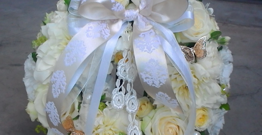 1輪ずつ丁寧にワイヤーをかけ、リボンやパールなども 組み合わせて、上品に仕上げます。